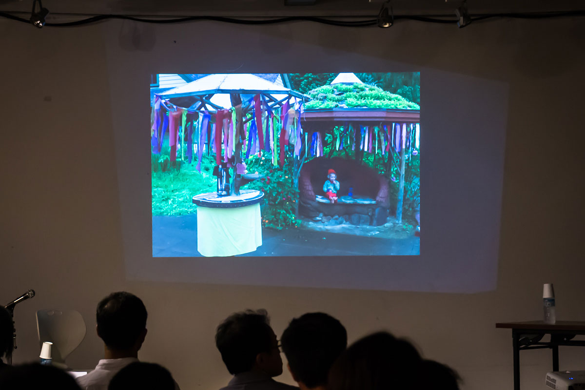 彼がつくっているものがいろいろあるんですが、すべて廃材をリサイクルして使っています。(写真を見せながら説明)屋外、あえて屋根をつけないところもあれば、雨をしのげるものがついてるものもありますけれど、これを自分の住んでいるところの近くでやり始めたんですね。こういうものをつくって、とにかく人を繋げる空間にしたいということで、近隣の人たちを招いて、とにかく交わるということを起こし始めました。