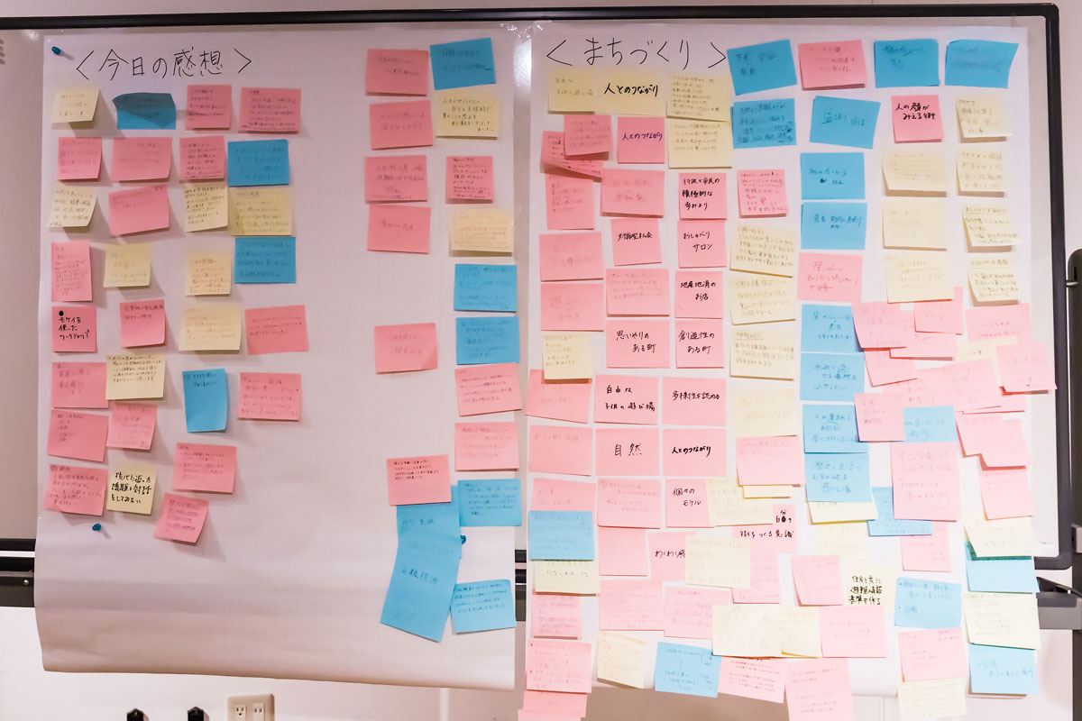 たぶん話している時は夢中で、書いてない方も多いと思うので、ポストイットを2枚ずつ用意してください。1枚目はまちづくりについてこれが大事だと思う。もう1枚の方は、今日この会に参加しての感想。向こうに貼る場所を分けているので別々に書いてください。いくつでもいいです。書き終わった方から、模造紙を貼ってあるところへ貼っていってください。