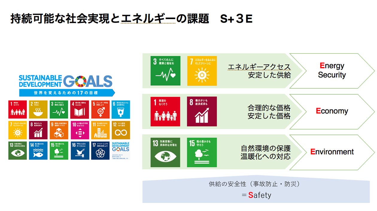 その下に書いてある供給の安全性、これがS、Safetyなんですけれども、若干エナジーセキュリティーと混同しやすいことでありますけれども、これはどちらかというとエネルギーの利用とか供給にあたって事故が起きてはいけない、あるいは災害が起きたときにこれが全部止まってしまうということにならない、あるいは人命が失われることにならない、ということで、供給の安全性、技術的な安全性を担保すると。