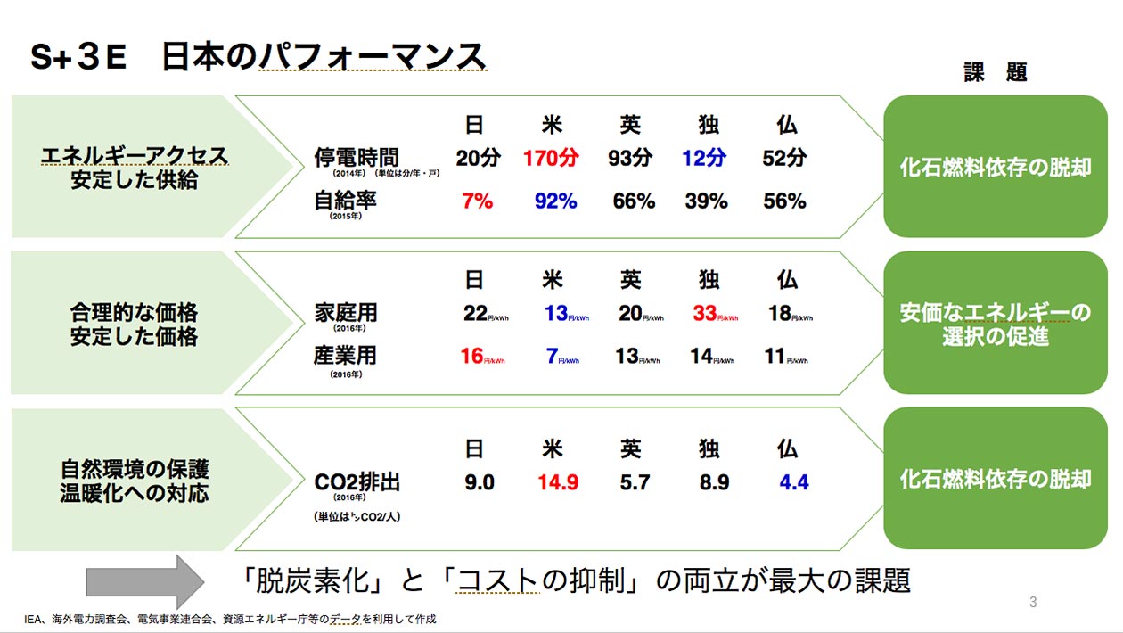 そういった中で、課題が下にある通り、化石燃料依存を下げていきながらコストを抑えるということでこの3つのEのパフォーマンスが上がっていくということがお分かりいただけると思いますが、そのためにも日本のアクションプランをどう描いているかというものが、まさに枝廣先生にもエネルギー基本計画を定めるにあたって議論いただいた内容に繋がってくるわけです。