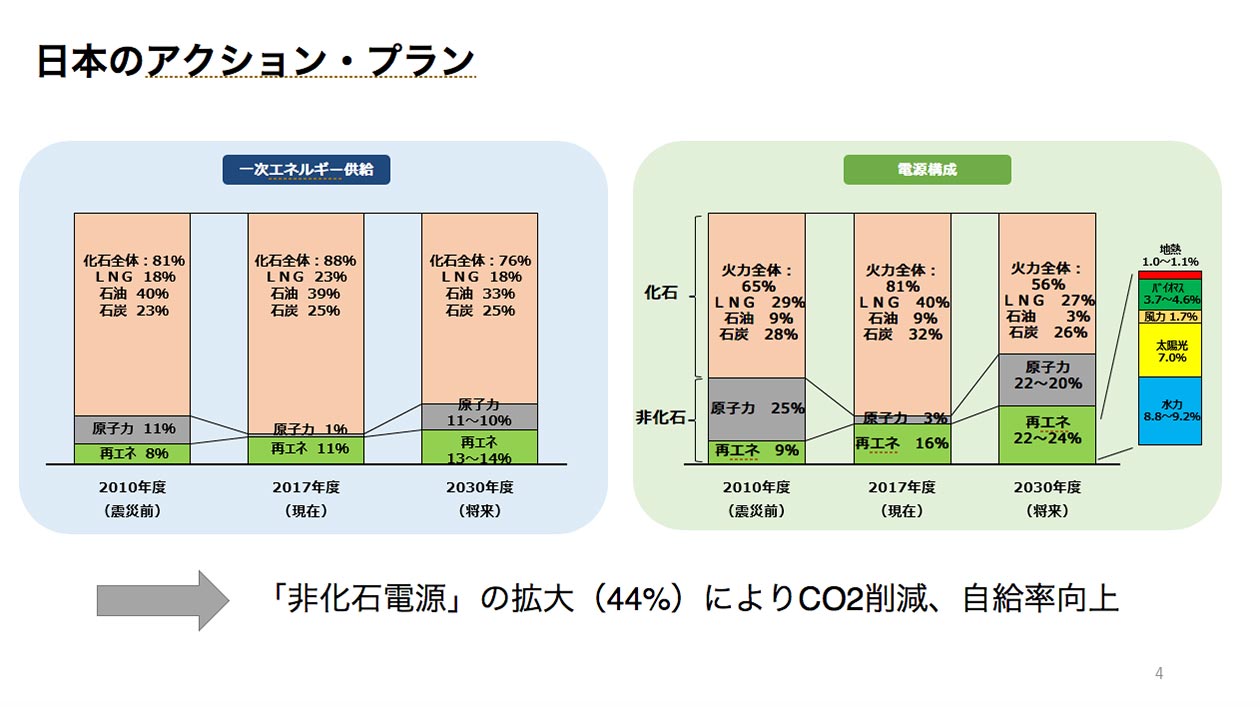 これを2030年に向けて、今、国が目標としておりますのは再生可能なエネルギーの22~24%、原子力も22~20%まで切り上げることによって化石燃料依存を56%まで下げるという目標を持っています。