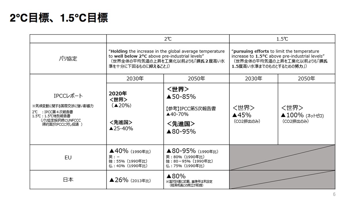 今申し上げたエネルギーミクスは、「2℃目標」と「1.5℃目標」の中の「2℃目標」の数値目標になっています。すなわち、パリ協定の中では2050年以降において世界平均気温上昇を摂氏2℃以内に抑えることを目標として、NDC(国が決定する貢献目標)と2030年の行動目標を作っております。